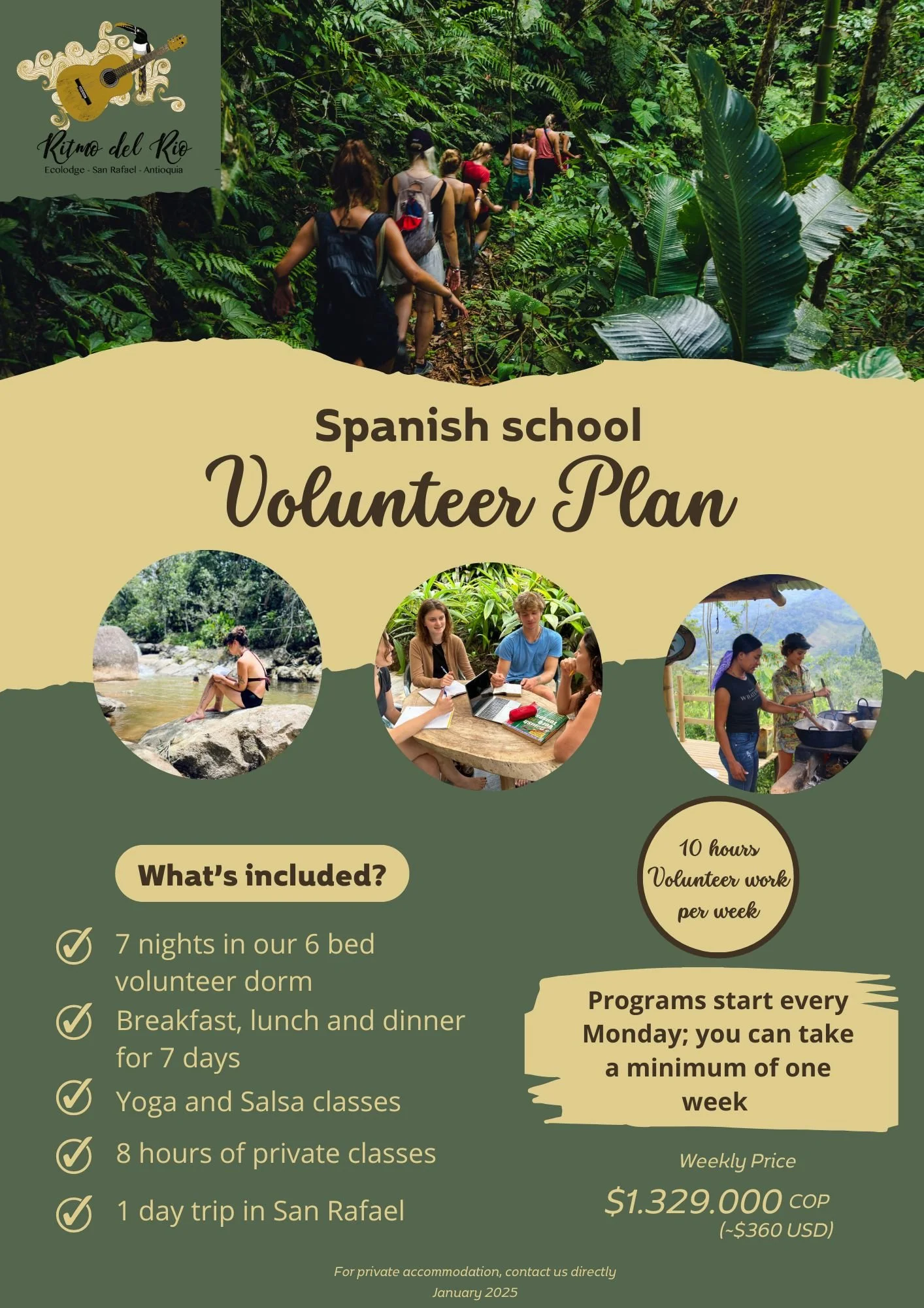 Just three hours from Medellín, Ritmo del Río offers immersive Spanish learning on a nature reserve outside of San Rafael, Antioquia. Our private lessons take place on a lush jungle reserve, surrounded by rivers, waterfalls, and gardens—an unforgettable way to connect with language and nature.
